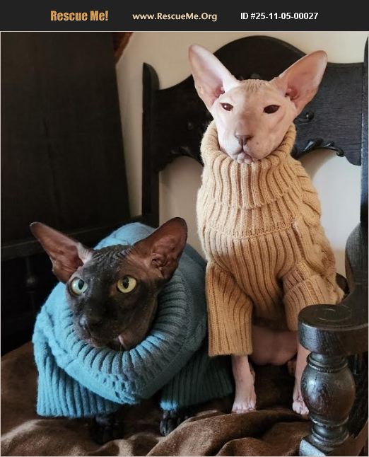 Georgi and Sev are two male bonded Peterbald boys(They are not sphynx, but Peterbald breed is not listed as an option on this site), aged 4 and 6. They are extremely affectionate and needy. These cats are not independent, and require at least 4 hours of attention daily to be well adjusted. They are also very vocal, particularly when not being held. They cry loudly for you to pick them up, which may interfere with some people's work if they work from home. These cats DO NOT suffer from HCM like Sphynx do.