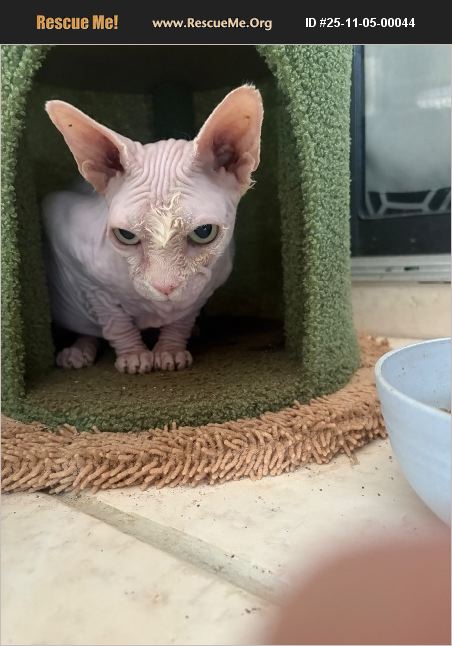 Very sweet old sphynx cat. She pretty much just always wants to snuggle and be petted. She sleeps most of the time.