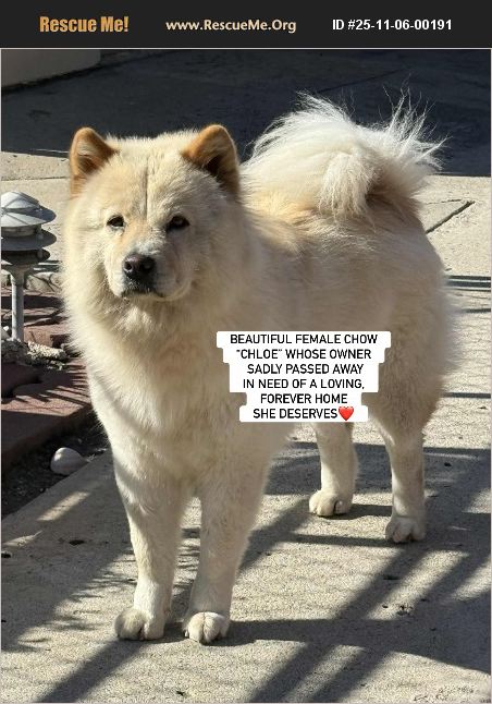 Courtesy Posting: SAN DIEGO COUNTY, CA (LEMON GROVE AREA IN S CAL)- BEAUTIFUL FEMALE CHOW 'CHLOE' WHOSE OWNER SADLY PASSED AWAY- IN NEED OF A LOVING, FOREVER HOME SHE DESERVES Please help us find a loving and forever home for dear Chloe, whose owner recently passed away where she lived since a young puppy. A family member is currently taking care of her but may not be able to hold her much longer due to other small pets. We are told Chloe is approximately 4 years of age and the family stated, 'she is good around people once she knows them. But she growls at first. She is stand offish at first. But once she knows you she is sweet. After two weeks of visiting, she built a relationship with us.' Chloe may need to be brought current on shots as they could not find records, and will need to be spayed as a condition of her adoption, and this may be sponsored. With other dogs, we were told, 'When we walk her down the street, she barks at dogs who bark at her. She barked defensively. She was redirected and okay.' She has also had issues over food at times with the other dogs in the home. They clarified she 'is fine with the yorkie, but not with the other dog. They rival for attention.' As a result, the dogs are separated from her, and she is currently living outside in a covered area. However, the family believes she was a house dog before, and also potty trained. Chloe has no reported bites the family was aware of. The family has known and been visiting Chloe over the years. They do not how she might do with other dogs, cats or small children, the latter she has never been around so a meet and greet would be requested. If you are dog/chow savvy and are interested in meeting and adopting Chloe, please contact [email protected] or Southern California Chow Chow Rescue Network who is trying to assist with her placement. All adopters will be asked for a home check (which may be virtual), an application, a vet reference, proof of prior chows, and a signed adoption contract agreeing to cooperate with her being spayed. We have additional pictures and will be posting these and videos of Chloe as we receive such and post them on her facebook page at: https://www.facebook.com/debbie.alder.14/posts/pfbid0nFYSwEzG335pwPSK1x85MAxVyZT6itnfo6Sqq6DYLMAgPGKy6einkDKSro7RUrBHl Note to view contents of link you will need to copy and paste it into your browser.