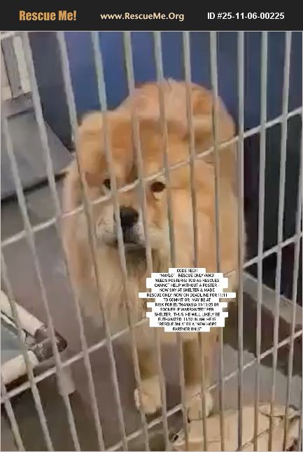 Courtesy Posting: CODE RED AT PHOENIX, AZ - ID #A5153654 -'MAYLO' AT MARICOPA COUNTY ANIMAL CARE, WEST LOCATION- RESCUE ONLY (NHO) - NEEDS FOSTER(s) TOO AS RESCUES CANNOT HELP WITHOUT A FOSTER. NOW SHY AT SHELTER AND MADE RESCUE ONLY! NOW ON DEADLINE FOR 11/11 TO COMMIT OR 'May be at risk for euthanasia 11/13/25 or sooner if warranted' per shelter. THUS, HE WILL LIKELY BE EUTHANIZED 11/12 in AM. HE IS 'RESCUE ONLY' BY A 'NEW HOPE PARTNER ONLY' which means he can NOT be adopted from the shelter directly, and New Hope partner must pull him out. Emergency/soon to be euthanized! We are in urgent need of finding a chow savvy foster, or at least a foster familiar with chows or similar Asian or spitz breeds. 'MAYLO' is a stunning male chow weighing 53 lbs and said to be only 1.5 years old who was surrendered with a female chow friend named Amina who is adoptable though. The two chows may have been used to breed as the female looks like she has recently had puppies and very underweight at only 36 lbs. However, owner surrender notes give the excuse that she could not keep the dogs due to her housing situation, and further state, 'THE TWO CHOW CHOWS BEING SURRENDERED TO THE SHELTER TODAY AND THEY ALSO LIVE WITH AN AKITA. OWNER STATES THAT ALL DOGS GET ALONG VERY WELL TOGETHER, EXCEPT FOR WHEN THEY EAT, THEY MUST BE FED SEPERATELY. OWNER STATES THAT SHE TAKES BOTH DOGS TO THE PLAY YARD AND THEY GET ALONG WELL WITH OTHER DOGS. THE MALE DOG IS VERY PLAYFUL, WHILE THE FEMALE DOG IS A LITTLE MORE STANDOFFISH. OWNER STATES THAT THE FEMALE DOG MAY BE MORE PRONE TO HAVE DOG TO DOG AGGRESSION DUE TO HER BEHAVIOR OF BEING A LITTLE STANDOFFISH, BUT THE MALE DOG IS FINE.' They are recommended for 'ADULTS ONLY, NO SMALL KIDS. OWNER HAS NEVER HAD THESE DOGS AROUND ANY SMALL CHILDREN, SO SHE IS NOT AWARE OF WHAT THEIR BEHAVIOR WOULD BE AROUND KIDS. OWNER STATES THAT BOTH DOGS INITIALLY BARKS AT STRANGERS, BUT THEN THEY SETTLE DOWN AND CAN BE EASILY RE-DIRECTED.' She further stated they have not shown aggression to people and were inside dogs who are potty trained. Additional behavior and medical details may be found on this link: https://apps.pets.maricopa.gov/priority/Details/OTI3-NjU3-NzJB Sadly, because Maylo was a little shy as is so common for the breed, the shelter made him Rescue Only and put him on a short deadline of 11/11. However, a volunteer met him and provided us wonderful videos of him gently taking treats and said, 'By the time I left anytime I passed his kennel he came out with his tail wagging or would just be sitting waiting and watching. Not a peep.' We are therefore looking for ideally a foster or foster to adopt Maylo who has some chow, Asian or spitz breed experience. His female friend Amina is adoptable currently, but may also be soon at risk like Maylo is. She is not Rescue only so you may contact the shelter directly for her and this is Amina's link: https://apps.pets.maricopa.gov/adoptPets/Home/Details/A5153651 If you may be interested in fostering, fostering to adopt, or helping in some other way (ie., pledging for his rescue), please email: [email protected] asap at Southern California Chow Chow Rescue Network who is trying to find placement asap, AND also fill out a foster application on https://dogfoster.org/ so both entities can work on pairing a foster to a rescue group to help. Rescues can assist with neuter and medical. Rescue groups may contact the shelter directly at: [email protected] and by calling 602-506-7387 and providing ID. Maylo's facebook post with updates, additional pictures and videos are posted here: https://www.facebook.com/debbie.alder.14/posts/pfbid08imUJuFVcWYr6Y2e3q7f1sAQx8RsntM6pH4hojtadtZ4xwcSi6HSXcpj1CFwWYQul Amina's facebook post is: https://www.facebook.com/debbie.alder.14/posts/pfbid0Tx2A5JxtHWugrT1gLLibJkKjMXJi9jJuF4qSffw4Rnj3LXc4GXnQfSUBZnULco6nl Note: to view contents of links you will need to copy and paste each one separately into your browser.
