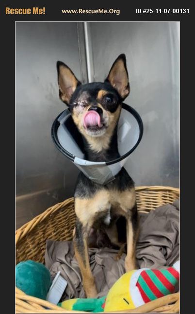 Meet Taco! This charming Min Pin mix is a little shy at first, but quickly turns curious and sweet. Taco came to us with a severely injured right eye which ended up having to be removed - but don't worry! He's healing beautifully and hasn't lost his zest for life (or treats!). Taco loves a good snack and takes treats gently from your hand. He's got a playful side that loves toys. He'll happily fetch a squeaky toy and bring it back to his cozy bed to amuse himself with.