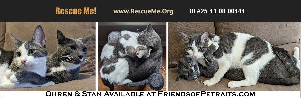 Stanley and Ohren are gorgeous, playful, and sweet, best friend grey and white male cats looking for a loving guardian - preferably together. Ohren is a four-year-old, 12-pound, grey and white, fun, friendly and playful lap cat. Stan is an adorable, seven-year-old, 15-pound, grey and white tuxedo who loves his buddy Ohren. Ohren and Stan are well-behaved in the home, use their litter boxes and love snuggling together on the couch or in a cat tree. These boys are healthy, neutered, up-to-date on rabies and distemper vaccines, microchipped, dewormed and virus-tested negative. Ohren is gregarious with other cats; Stan only has eyes for his best friend Ohren, but he does love humans. Neither has shared a home with a dog before. To meet and possibly adopt Ohren and Stan, please fill out an adoption application https://friendsofpetraits.com/cat-adoption-application/ After the application is complete, please contact [email protected] to schedule an appointment to meet them. Their adoption fee of $300 as a pair benefits the Friends of Petraits Rescue. They are being fostered in Chicago's Rogers Park neighborhood.
