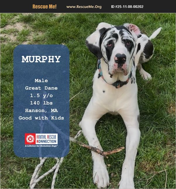 Murphy is a very sociable Great Dane mix who takes love to a whole new level. He loves people and turns strangers into friends at record speed. With cuddles at the ready, his affectionate nature will make your troubles melt away. And those bandit eyes? Simply irresistible! He also loves going for car rides. Made for road trips, he's a great travel partner you can take almost anywhere. Murphy scores low on the energy meter, though he loves going for short walks and playing with any toys of the chew or stuffed variety. He also loves chasing after balls in the yard, but after 15 minutes of playing fetch he's ready for a snooze. He is so easy to please! He is a really good boy who has never been aggressive toward people. He prefers humans over furry friends and therefore looking to be an only pet, or possibly live with a female dog. While out on walks, he can walk past dogs without issues. Fun fact! Have you ever heard of a Saint Dane or a Daniff or how about a Saint Daniff? As silly as these designer dogs sound, Murphy does have some Saint Bernard and Mastiff parentage if you're into that sort of thing! This is a home-to-home adoption. When Murphy joined his family as a puppy, they had no idea he'd grow aggressive toward their other male dog. He gets along better with his female sibling, but it's a big no-go for the brother. The owners tried very hard to create harmony, but Murphy has put his paw down on that idea. Though 1-�%BD years old, as a big dog he's still considered very young. He is smart but his new person will ensure he maintains good manners. People are not bowling pins! No small children due to his size. Please contact the current owners at [email protected] and tell them Animal Rescue Konnection sent you!