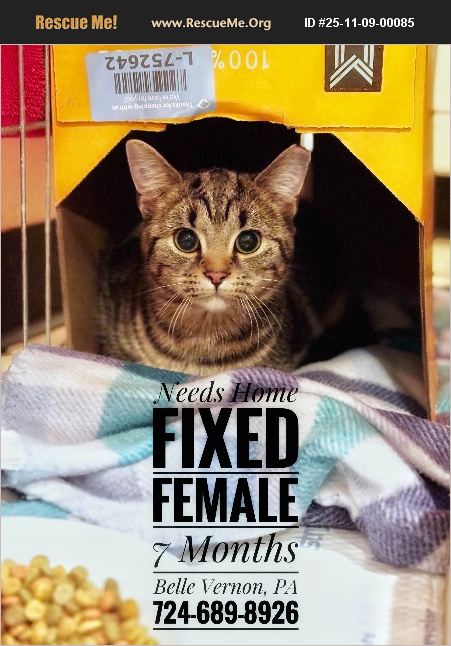 Baby Tibbs is a 7 month old fixed female kitten that is ready for a new life. She has vet paperwork and is fixed, up to date on her shots, de-flea-ed, and dewormed. Baby Tibbs was caught as a part of a TNR program. She is still young and friendly enough to be socialized, so we wanted to give her a chance to find a home, although we are not equipped to hold her for much longer than a week or two, so we will have to re-release her if we do not find her a home within that time. She has human contact throughout her life and has been relaxed and non-aggressive for our volunteers. We are in Belle Vernon, PA (15012) and can be contacted at 724-689-8926. If you live further away, we can meet at a midpoint.