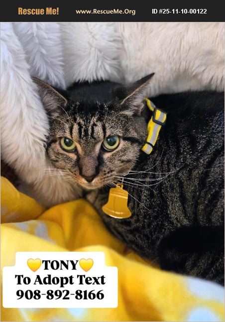URGENT! SAVE TONY - The Sweet Soul Who's Ready to Love Tony is a young, tiger-striped tabby boy with the softest fur and the gentlest heart. This handsome fellow was found alone and freezing during a snowstorm, but he's now safe, warm, and ready to find the loving home he deserves. Tony is calm, quiet, and oh-so-gentle. While he can be shy at first, once he feels safe and trusts you, he absolutely melts into your lap for the sweetest snuggles. He's the kind of cat who forms a deep bond with his person-he just needs a bit of patience and understanding to show you his loving side. He's fully litter trained, neutered, vaccinated, and microchipped-ready to go home! Tony also loves the company of other cats and would do best in a calm home with a cat-experienced, patient adopter who can help him continue to blossom. If you're looking for a loyal, loving companion who will reward your patience with endless affection, Tony may just be your perfect match. To Adopt please Text Message 908-892-8166 ****TONY**** Personality: Sweet, shy, gentle, affectionate once comfortable Good with: Other cats Litter trained: Yes Neutered, vaccinated & microchipped: Yes Come meet Tony and help him discover that the world-and your lap-can be a safe, happy place. ****To Adopt Text Message 908-892-8166