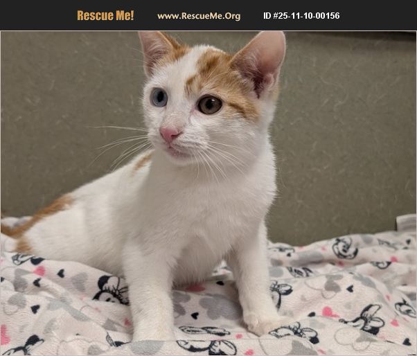 I am described as a male, white and orange tabby Domestic Shorthair. The shelter thinks I am about 14 weeks old. I weigh approximately 2.66 lbs. I have been at the shelter since Nov 05, 2025 and I may be available for adoption on Nov 14, 2025 at 10:00AM.