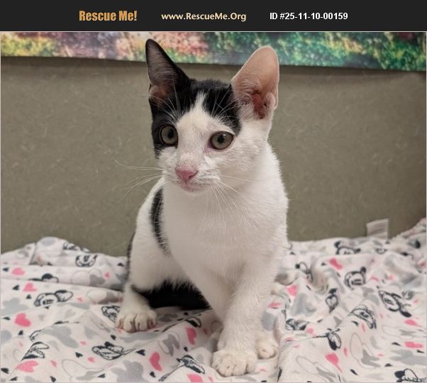 I am described as a male, white and black Domestic Shorthair. The shelter thinks I am about 14 weeks old. I weigh approximately 3.04 lbs. I have been at the shelter since Nov 05, 2025 and I may be available for adoption on Nov 14, 2025 at 10:00AM.
