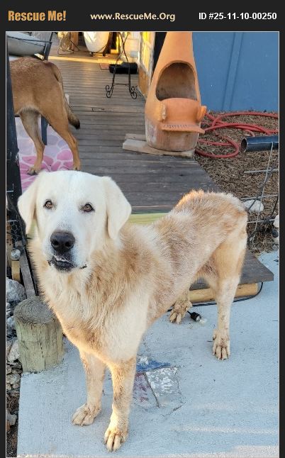 Dog was abandoned by prior owners so has been roaming the area for sometime. He seems to be good with all types of livestock. He has fought off coyotes, he's loving and sweet when he shows up, however I have 4 dogs and can't keep him. I have an alpha pyrenees and they do not get along.