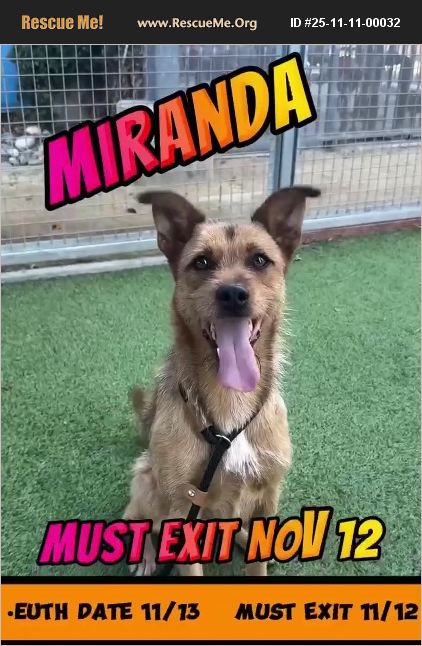 East Valley Animal Shelter has a Shepherd/Terrier on Euthanasia alert list for High FAS (fear anxiety stress)!!!! Video: file:///var/mobile/Library/SMS/Attachments/c6/06/AFBB88AF-7E7E-421D-B935-45F1EF5CC46F/5E79FA24-826C-4A40-8CB1-E36AEAF2D284.MOV Miranda, #A2220727, 1-year-8 months old 38.2lbs-Female. Came to the shelter as an owner surrender on 10/22/25. Miranda was added to Urgent on 10/24/25 with no interest. Miranda continues to lunge, charge and snap. Miranda is showing high levels of fear, anxiety & stress and needs to be out of shelter environment!!!! Last day to take animal: 11/12/25! Scheduled euthanasia date: 11/13/25! Transportation information is available contact Bonnie below. Lucy Ruiz Lifesaving Liaison/Foster Coordinator Animal Care Technician Los Angeles Animal Services East Valley Shelter 14409 Vanowen St Van Nuys, CA 91405 Cell: (213) 655-7613 Txt or call Work:(818) 756-9324 E: [email protected]