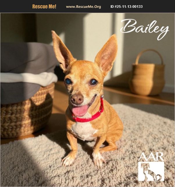 Bailey is a beautiful senior lady with a heart full of love and a surprising amount of pep in her step! She may be a golden girl, but she still enjoys walks, attention, and greeting her favorite volunteers with a happy wag and a sparkle in her eye. Sadly, her devoted owners could no longer care for her, but Bailey hasn't lost her joyful spirit. She takes life in stride - even with a few mild senior quirks like some vision aging and no teeth - none of which slow her down or dampen her enthusiasm for love and companionship. Bailey is ready to share her golden years with someone who will cherish her gentle soul and bright personality. If you're looking for a loyal friend who will fill your days with warmth and affection, Bailey would be thrilled to be your new best friend. ���� Est. DOB: 10/5/13 7 lbs. AAR does not transport for adoption.
