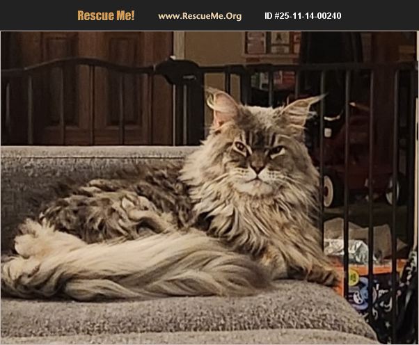 This beautiful purebred Maine Coon is looking for a forever home. She is good with dogs and enjoys a quiet, slow paced home, preferably without small children.