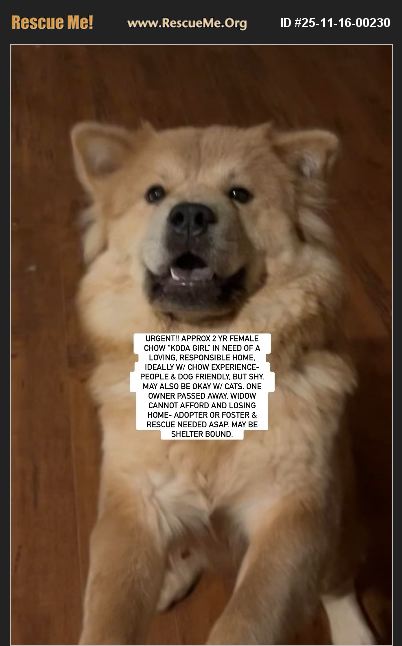 Courtesy Posting: X URGENT- SAN DIEGO, CA (SO CAL)- APPROX 2 YR FEMALE CHOW 'KODA GIRL' IN NEED OF A LOVING, RESPONSIBLE HOME, IDEALLY W/ CHOW EXPERIENCE- PEOPLE AND DOG FRIENDLY, BUT SHY. May also be okay with cats. One owner passed away, widow cannot afford and losing home- adopter or foster and rescue needed asap. May be shelter bound. Please help us find a loving, responsible home for beautiful Koda Girl after she and her siblings were taken in by a family member in the La Mesa area after being given up by their former owner. While the other siblings have since been adopted, Koda, who was originally the shyest, but more loving one, is still in need. Koda is continuing to make progress, but after a death in the family and now losing their home, they cannot keep her much longer, or the other two chows (Lyla, who is the mom, and Jude, who are adoptable separately). We do not want any of these dogs to end up at the shelter. Koda Girl did very well with her female siblings, and is described as quite loving once she gets to know you, and we have nice video showing how affectionate she can be. She has lived with older kids, other dogs, and a cat and the family said, ' She goes for walks more and does really well on a leash now. Still very sweet and very shy. She will be scared until you sit down with her and talk to her and give her time but too much comotion scares her. She does well with other dogs except her and Lyla don't like each other very much for some reason but she does not seem to have an issue with any other dogs.' While she has been dog friendly and around the cat in the home, if you do have an another pet, a meet and greet is strongly recommended. Currently, Koda has been trained to go on pee pads inside, but also goes potty outside. She has spent a lot of in a crate be rotated in and out. We would like to see any new home keep her as an indoor but free roaming pet, and also able to take her on more regular walks, and continue with socialization. She has no reported bites or medical issues. Koda has been vaccinated and will need to be spayed as a condition of her adoption. A rescue may assist with this if we can find a foster. If you are interested in applying to adopt or foster Koda Girl, or the other two chows in this home, please contact [email protected] or Southern California Chow Chow Rescue Network who is assisting with her/their placement. Chow experience is preferred. All adopters will be asked for a home check (which may be virtual), an application, a vet reference and an adoption contract. A $150 donation to a chow rescue is also requested. Lyla and Jude are also available to adopt and are posted separately. We will be posting more pictures and videos of Koda on facebook at: https://www.facebook.com/debbie.alder.14/posts/pfbid02Xy5bbsdBkJAHDGngzmWjMJuWGh3AcdMM55krQpNwE4HWPjUzGc2GecZE3WXRR723l Note: to view contents of link you will need to copy and paste it into your browser.