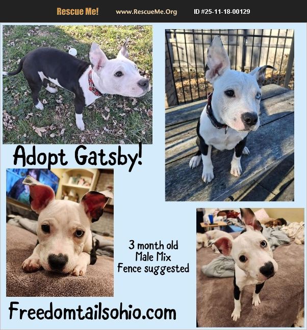 Adopt Gatsby Male 3 months old Fence preferred This adorable puppy is abt 3 months old, 20lbs, and a pittie mix. He has such presence. Looks like he's wearing a black onesie! He is fun and playful. He loves to go outside but also likes to cuddle. He pays attention to what is going on around him and he wants to have a bond with his person. So far he's doing well with leash training. Needs to continue working on that and potty training. Doing great with crate training. Very good with other dogs. Nice combo of active but not hyper. Very expressive ears! Fostered in Columbus. Please apply at www.freedomtailsohio.com