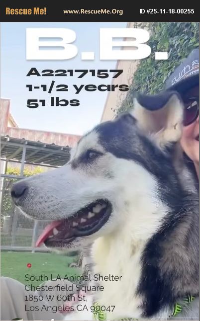 Urgent LISTED simply due to SPACE!!!! This beautiful boy is on borrowed time just because of space!! He's a sweet playful boy but just because of space he could lose his life!!! Video: https://fb.watch/DsOVgDsUg3/?mibextid=wwXIfr&fs=e B.B., A2217157 - NEUTERED MALE, SIBERIAN HUSKY, Shelter: SOUTH L.A. Age: 1 YEAR 9 MONTHS, 51.00 lbs. This animal has been at the shelter since 08/24/2025 and on this list since 10/29/2025. Urgent Listing Reason: The shelter is beyond its capacity to care for our animals. Added to the urgent list due to space.