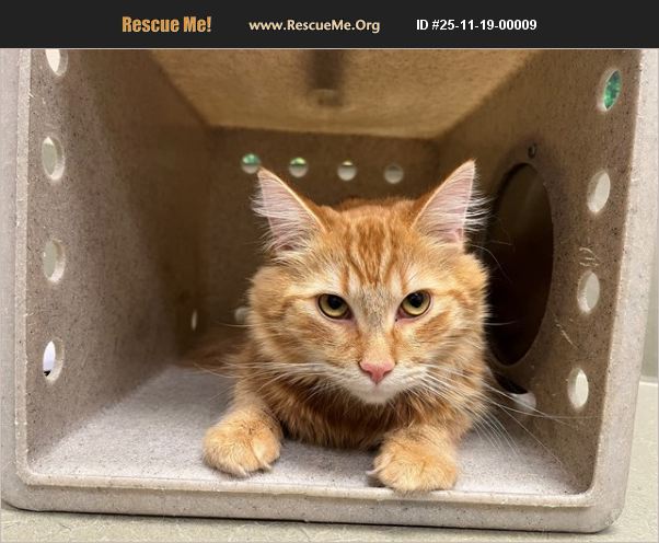 I am described as a male, orange tabby Domestic Longhair mix. The shelter thinks I am about 2 years. I weigh approximately 9.68 lbs. I have been at the shelter since Nov 13, 2025 and I may be available for adoption on Nov 20, 2025 at 10:05AM.