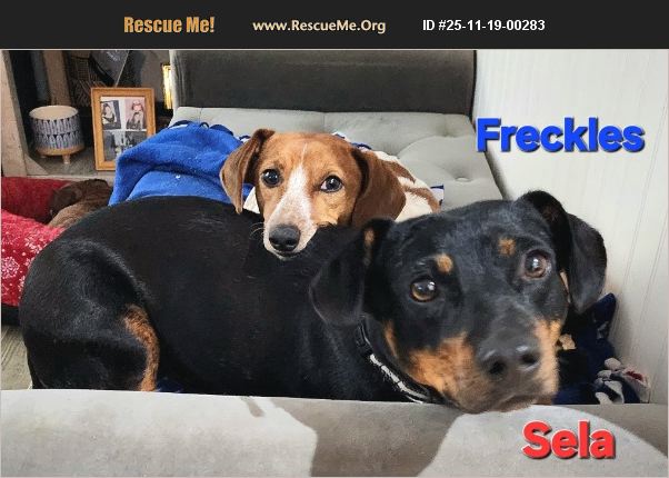 A unique pair is looking for their forever home together -- piebald doxie Freckles, 2 years, 13 pounds and mix Sela, 4 years, 27 pounds; Sela is a low rider, long doxie body with a rottie face! Freckles is timid with new humans, needs time to warm up. He adores Sela. She has a wonderful personality, loves everyone; just a sweet, happy, affectionate, good girl. Both are great with other dogs, very playful. A securely fenced yard is needed. Fostered near Philadelphia, PA. Adoption fee pair $775 www.longdogsrescue.org/application