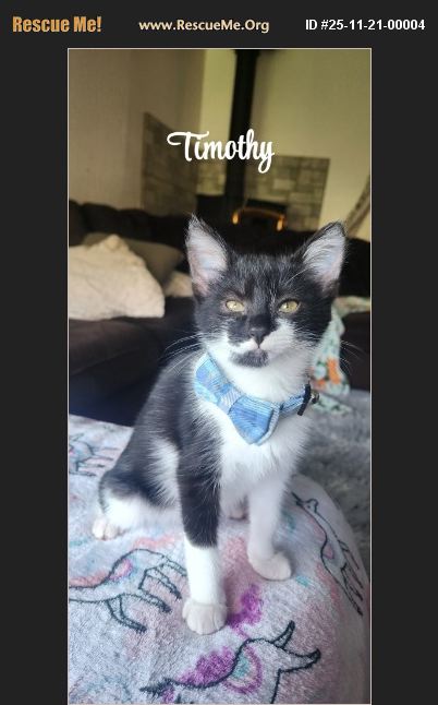 Follow the Leader. Meet Timothy- the sweetest little tuxedo Timothy is an adorable tuxedo kitten with a most adorable personality! He is like a little baby who follows your every move! He and his siblings were discovered living under an abandoned trailer with their mama. When we trapped her, we were shocked to learn she wasn't feral at all - she had been dumped with her babies. Their story could have taken a heartbreaking turn�'�| but instead, everything changed thanks to Melaina, an incredible human who devotes her time to trapping, caring for, and lovingly socializing cats so they can find the homes they deserve. This little guy is a full-blown love bug. He adores other cats, snuggles into furry friends without hesitation, and is guaranteed to be your loyal companion. His favorite cuddle spot? Right under the sheets in your bed, curled up like he's always belonged there. Timothy is ready for a forever home filled with love, warmth, and lots of snuggle time. If you are interested in meeting Timothy bgive us a call or complete an application today! Call now 707-972-9359 or 530-570-4538 or 707-354-1211