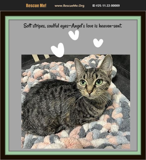 Meet One look into Angel's eyes, and you'll never want to look away. Meet Angel: Petite, Playful, and Ready to Be Your Heart's Companion Angel is a 10-12-month-old tabby sweetheart with mesmerizing green eyes and a heart full of love. She's a very young momma whose kittens have all found homes-and now it's her turn to be cherished. This petite cuddlebug is a master biscuit maker, a purring machine, and a blanket-snuggling pro. She adores rubbies, interactive play, and cozy companionship. Angel is social, affectionate, and thrives in a home where she can be herself-charming, clever, and endlessly endearing. What Angel's Looking For Angel blossoms with a friendly feline companion, especially a playful male buddy who can match her energy and affection. She's also great with dogs and adapts well to new faces. Her dream home includes: ��%BD��%BD%BD'��%BD A resident cat (male preferred) for play and snuggles ��%BD��%BD%BD'��%BD Humans who love lap time, rubbies, and interactive play ��%BD��%BD%BD'��%BD Kids over 10 years old that gentle with pets ��%BD��%BD%BD'��%BD A cozy space with soft throw blankets and room to be her clever, cuddly self Adoption Perks ��%BD��%BD%BD'��%BD Spayed ��%BD��%BD%BD'��%BD Vaccinated ��%BD��%BD%BD'��%BD Microchipped with free lifetime registration ($199 value!) ��%BD��%BD%BD'��%BD No bad habits-unless you count her clever gate escapes ��%BD��%BD%BD'��%BD 15% off your entire purchase at Pet Supplies Plus (Hanes Mall, Winston-Salem) when you adopt Black Friday Special Angel's adoption fee is $150. Adopt her by 11-30-25 and take $50 Off!! Two-week trial adoption available-we want Angel to be truly loved, and we'll always welcome her back if it's not the right fit. Angel's ready to trade her momma duties for a life of love, play, and purrs. Could she be your perfect match? Soft stripes, green eyes, and a heart that whispers 'home.' Apply online: rustystalesrescue.com/adoption-application