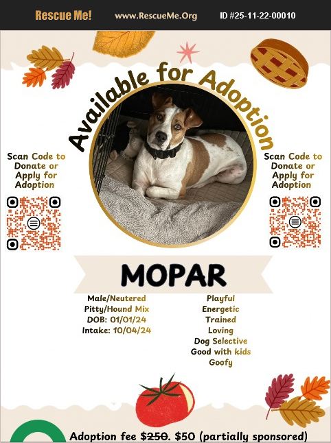 Mopar is a pitty/hound mix. He's been trained in basic commands but his leash skills still need work. He is dog selective so meet and greets are a MUST. Fill out the application and we'll be in touch https://www.shelterluv.com/matchme/adopt/LHP/Dog?fbclid=IwZXh0bgNhZW0CMTEAAR1ziONF_3iWfa4U-MbsOiqjYZxWD6ADWOHOowyajW6UoQ1YO4JSg6ccGMM_aem_MjFRB-NUCTnAA1j0MAsSTg