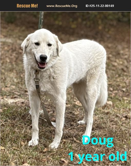 Meet Doug! Doug is a handsome 1-year-old Great Pyrenees/Lab mix with a gentle heart and a sensitive soul. Although his previous home's DNA test labeled him as 100% Great Pyrenees, we know his mother wasn't a Pyr-so he's truly a unique mix! Doug has had obedience training, but he's still quite skittish and needs a patient, calm adopter who can help him continue building confidence. Because of his timid nature, he is not suited for homes with children under 10. He does well with other dogs and cats and would thrive in a quiet household where he can feel safe and settle in at his own pace. Doug has been neutered, microchipped, vaccinated, dewormed, and heartworm tested negative. His adoption fee is $250. If you have a peaceful home, a gentle approach, and a heart ready to help a shy boy blossom, Doug may be the perfect match for you.