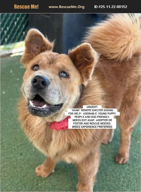Courtesy Posting: FRUIT HEIGHTS, UTAH (NORTH OF SALT LAKE CITY) - ID #61906- 'HANK' at ANIMAL CARE OF DAVIS COUNTY REMOTE SHELTER ASKING FOR HELP- ADORABLE, YOUNG PUPPY, PEOPLE AND DOG FRIENDLY- NEEDS EXIT ASAP- ADOPTER OR FOSTER AND RESCUE NEEDED, BREED EXPERIENCE PREFERRED The Davis County shelter reached out to us for help as these puppies have had no interest. The shelter told us puppies are the siblings who are now 8-9 months old, 'came to us along with half a dozen Chow Chow dogs last week and we received two litters of young pups earlier this summer from the same owner. His owner kind of lost control of his intact adult chow chows. The dogs are all fine with each other. All of them are decent in playgroup. Occasionally there is normal beef while they work things out but no fights, nothing concerning at all. Mostly they prefer to be on the fringes of the playing, occasionally entering for short stints. Tolerant is a good descriptor. Throws play bows here and there, will sometimes join in a group run across the yard. Nothing rough or rowdy. All of the chows need slow movements when you first approach them.' We are therefore recommending prior chow experience. While most of these dogs and puppies have now been placed, Hank is still available, likely due to having his head partially shaved (and thus gets overlooked, even though fur grows back), and his brother, Rocco, who has some potential medical. We are looking for either responsible adopters, or fosters and rescues for each pup, they do not need to go together. Regarding Hank, the shelter said, 'Our trainer says he is the second nicest one out of the group, easy to handle, a little bit head shy at first. Sweet over all. Typical chow, suspicious of new people and once he knows you, you're now his soul mate. Hank was very grumbly and avoidant when he arrived here. Hank has done well in play group, tolerant and sometimes playful. He has started to hit the brakes when returning to the dog kennels, he would rather be outside.' Pardon the BAD haircut, but luckily fur grows back. The shelter also let us know he someone had grabbed him when he was running away and he had nipped back at them but didn't break any skin. However, it is recommended to therefore go slower and not suddenly grab him. Other than that, the shelter described him as a 'very sweet boy'. We have additional pictures and a videos the shelter which will be posted online. For direct shelter adoption or rescue inquiries, please contact the shelter directly at: 801-444-2200 and ask for if you require additional assistance, or email: [email protected] Some transport may be available for qualified rescues, adopters must come in person. The shelter will then neuter for an adopter. Please also contact [email protected] or Southern California Chow Chow Rescue Network if asap you are interested in fostering, or pledging for his and/or his brother's rescue, as rescue groups need a foster and support to save. Hank's facebook post with photos and videos is: https://www.facebook.com/debbie.alder.14/posts/10168098382298125 Rocco's facebook post with photos and videos is: https://www.facebook.com/debbie.alder.14/posts/10168098349178125 Note: to view contents of links you will need to copy and paste each one separately into your browser.