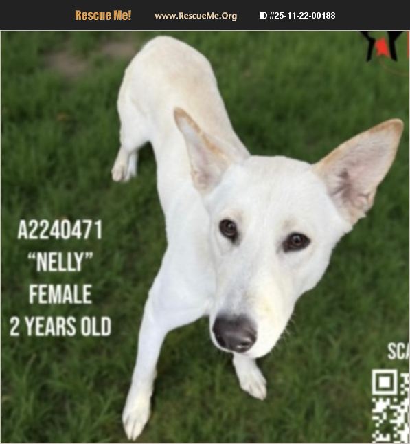 URGENT LISTED DOG IN NEED OF ADOPTION OR FOSTER LOCATED AT SOUTH L.A./CHESTERFIELD SQUARE SHELTER!!! NELLY, A2240471, SPAYED FEMALE, WHITE GERMAN SHEPHERD, Shelter: SOUTH L.A. Age: 2 YRS, 1 MO, Weight: 46 LBS. This animal has been at the shelter since 10/23/2025 and on this list since 11/22/25. Urgent Listed for kennel stress & declining in the shelter environment!!!
