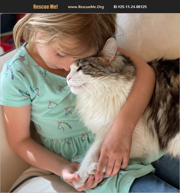 Quiet and affectionate purebred Maine Coon cat in need of a new home because family is moving out of the country. Great with dogs and kids.
