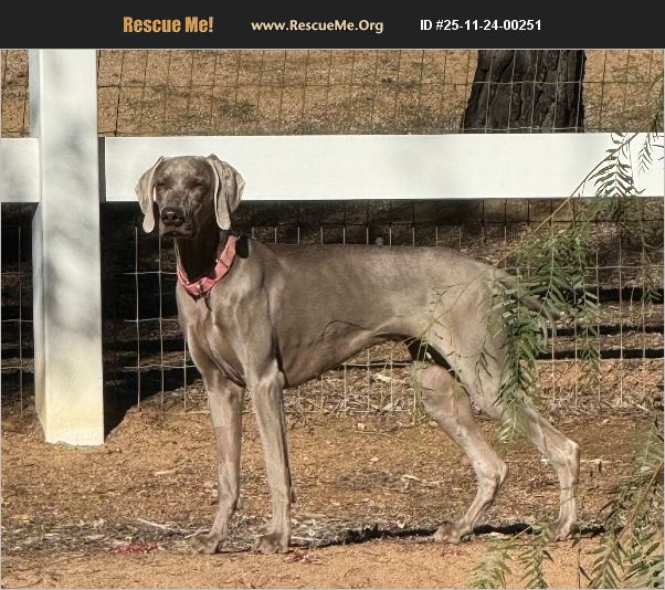 There's a beautiful new girl in town! Meet 11 month old Skeeter. She is a petite little bundle of energy who has kind of had a beautiful, yet a sad life. This little angel lived with her mom her entire life being pampered and loved. She and her siblings all lived together as her human mom LOVED Weimaraners and actually bred them to show. Skeeter wanted for nothing the first few months of her life. Suddenly and very unexpectedly her mom got very sick. Skeeter and the others did not quite understand the sudden lack of walks and playtime. A couple months went by and her human mom passed away. It is a devastating time for family and friends.....they all want what is best and found wonderful homes for all of the dogs except Skeeter. She is very young with tons of energy and lacking now in some manners not having been consistent with training after mom got sick. She is full of life, loving and loves playing with other dogs. Initially she is very timid and shy having been a little sheltered during moms illness. During her first couple days in foster with us we've learned a lot from her. She is an avid counter surfer and will take advantage if you leave the room or turn your back. Obviously very food motivated but not food aggressive. She eats well around her new three foster sisters. The car is her haven....once you get her into it. She loves car rides and prefers the shotgun seat...or floorboard. She just wants to be with her person. No seats available up front? The she settles in very well being a backseat driver. Her favorite thing is cuddling up on the couch with whoever she has chosen as the one she trusts the most. Crating? Not so much. During the last couple months she slept with her mom on the bed, then her grandma took over after her mom was gone so she is VERY used to snuggling into a tight little ball right next to you. We are sure she would do well with crate training in time. She's a willing learner and super smart. Come meet her before she's gone. She is a brilliant diamond just waiting to be polished! Currently fostered in Riverside area of Inland Empire.
