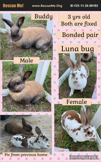 These two sweethearts are a fixed bonded pair who are looking for a loving inside home. They are 3 years old and love each other so much, so they must stay together. Both are sweet and friendly and will make a great addition to your family! Sometimes bunny bonding can take time, but with a bonded pair the work has already been done for you. They are both Rex mixes, but the girl has the soft velvet coat like a Rex. If you were interested in giving these adorable bunnies a loving home, please text or call (409)-791-9517 or message the page directly at https://www.facebook.com/TheBunnyHutch22/ Also check out our other available bunnies! At https://www.adoptapet.com/shelter/272325-the-bunny-hutch-hortense-georgia