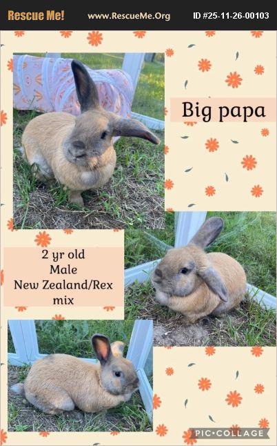 Meet big papa, this beautiful bunny came to me with several other bunnies recently, and he is just super photogenic! I love his floppy ear and how he poses. He is a two year-old New Zealand/Rex mix. Very sweet and friendly. He is a very chill bunny, but is also curious. This sweetheart has been an inside bunny and also likes time outside to enjoy digging. If you were interested in giving this adorable bunny a loving home, please text or call (409)-791-9517 or message the page directly at https://www.facebook.com/TheBunnyHutch22/ Also check out our other available bunnies! At https://www.adoptapet.com/shelter/272325-the-bunny-hutch-hortense-georgia