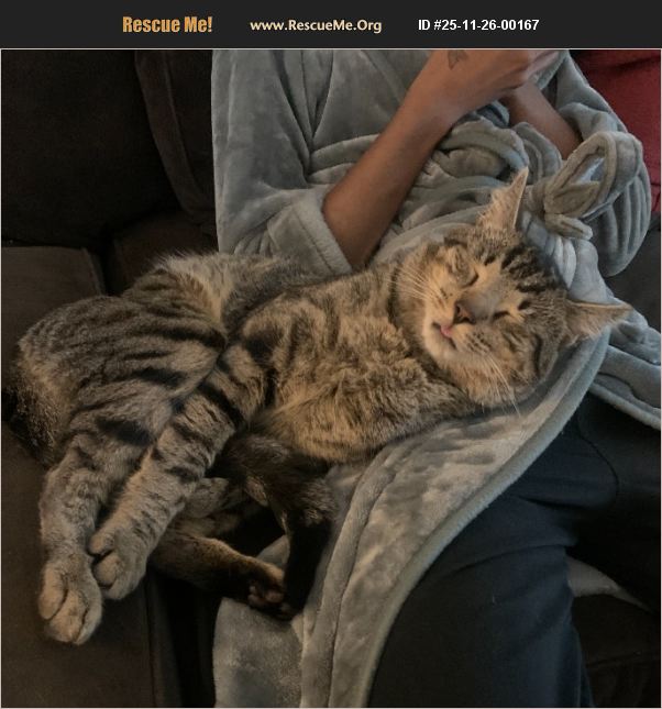 I have 4 of the sweetest cats in the world. I am disabled and moving. I can't take them with me. Tazz is 1.5 years old. He needs to be neutered. He also loving but very Independent. He likes to play with the other cats. He is litter box trained. He is active and has no problem with going outside for shorts period of time.