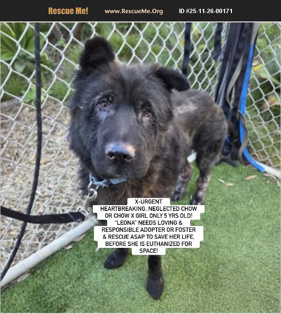 Courtesy Posting: X URGENT AT LA CITY SHELTER WHICH IS FULL! LOS ANGELES ANIMAL SERVICES- SOUTH LOS ANGELES SHELTER- HEARTBREAKING, NEGLECTED CHOW OR CHOW X GIRL ONLY 5 YRS OLD!- LEONA' ID #A2242847 NEEDS LOVING AND RESPONSIBLE ADOPTER OR FOSTER ! RESCUE ASAP TO SAVE HER LIFE, BEFORE SHE IS EUTHANIZED FOR SPACE! Help! This LA City shelter is full, and this poor girl was found as a stray in horribly neglected condition, missing much of her fur, and brought to the shelter on 11/5. Leona has been estimated to be only 5 years old, though. and weighs 56 lbs, and was previously spayed. The shelter told us, 'She arrived with missing hair and the medical staff were only able to do a limited examination due to her fear/anxiety/stress. There are no additional updates to the medical record other than being treated for the skin condition and a URI. Once her URI is resolved, she may possibly be eligible for a playgroup outing.' We are now looking for a loving home or foster and rescue, or even anyone who can just go down and sit with her and hopefully provide us video and more info to help. She can also be fostered locally if in the shelter's area. Please contact the shelter directly by calling or using the listing link or by calling (888) 452-7381. If you can foster, but are further away or not in the shelter's jurisdiction, please also contact [email protected] asap or Southern California Chow Chow Rescue Network who is trying to assist the shelter with her placement. Please note rescue groups typically need a foster to save any dog. We will then try to pair you with a willing rescue group in time. Listing link: https://24Petconnect.com/DetailsMain/LACT3/A2242847 We will be posting her on facebook and any new updates and pictures and video as we receive such at: https://m.facebook.com/story.php?story_fbid=10168117479108125&id=783968124&mibextid=wwXIfr Note to view contents of links you will need to copy and paste each one separately into your browser