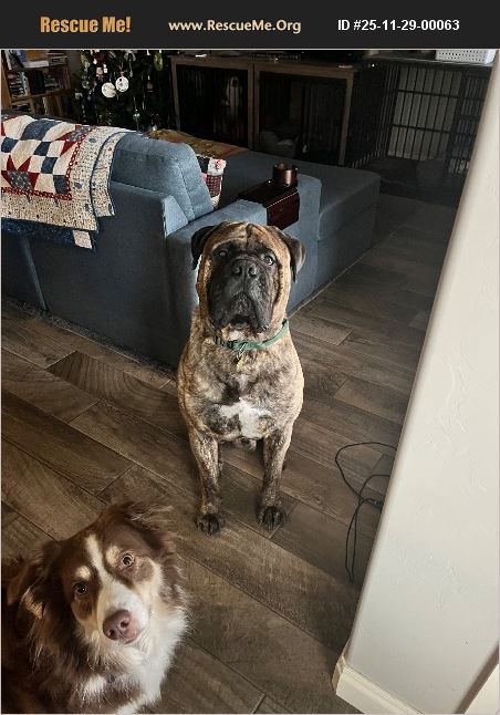 6 yr old purebred Bullmastiff. Due to our health and other dogs, we feel he could have a better home. He is not in danger, nor is he dangerous. We have 2 australian shepards, male and female and the male keeps attacking the mastiff.