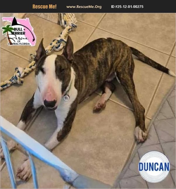This handsome boy was found as a stray & awaited his stray hold at the local shelter, where no owner claimed him. Duncan is 2 years old, underweight at 40 lbs & will be getting neutered. He has been very sweet, good in his crate, learning to walk nicely on leash & will bring you his toy. Learn more about our adoption process and check us out on Facebook and IG. www.BullTerrierRescueOfCentralFL.org Bull Terrier Rescue of Central Florida, Inc.