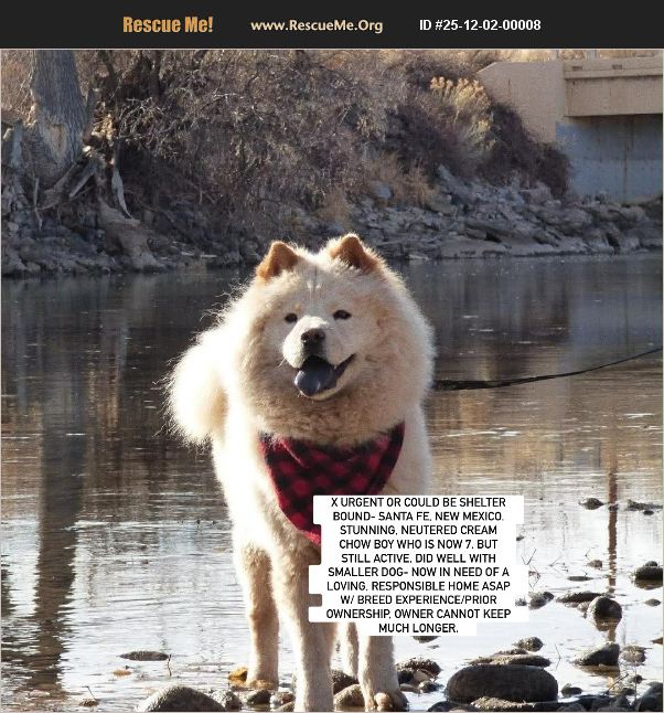Courtesy Posting: X URGENT or could be shelter bound- SANTA FE, NEW MEXICO- STUNNING, NEUTERED CREAM CHOW BOY WHO IS NOW 7, BUT STILL ACTIVE, DID WELL WITH SMALLER DOG- NOW IN NEED OF A LOVING, RESPONSIBLE HOME ASAP W/ BREED EXPERIENCE/PRIOR OWNERSHIP, owner cannot keep much longer. Please no negative comments as the focus has to be on finding placement, and we are Not the owner. Please help us find a loving, chow savvy home for very handsome Thor who is now 7 years young, healthy and still quite active and playful. We were contacted to assist with his placement due to this urgent situation. Unfortunately, the only owner he has known since he was adopted at 8 weeks just had to relocate to a new state. Thor is now living in an apartment where he cannot stay much longer. His owner is gone 12- 13 hours a day at work, and due to personal reasons, is not able to walk him before or afterwards, nor is anyone available to walk him regularly while the owner is at work extended hours either. Thor and his female owner previously lived in a home with a yard he could run and play in, and rarely barked all these years. However, with the owner gone half the day, and no one to regularly walk or exercise him, Thor has started to bark at sounds and neighboring tenants he hears. While he has not been socialized much with other people or dogs all these years, he did fine meeting a maintenance man who came into the new apartment and even gave him kisses and we have several videos with him from today (12/1). However, like many chows, Thor needs time to warm up to strangers and may bark and or growl at them initially, so breed experience is requested, and no small children in the home. He has done the same with larger dogs he has seen from afar so we are not sure how he might do with larger dogs, but a meet and greet would be requested. Please note Thor has also occasionally visited a family member who has small dogs, and he enjoyed running around with one of them, while ignoring the other who did want to engage in play. We have video showing how playful Thor was with the small dog which was taken approximately 3 years ago. Thor has been trained to sit and lay down, and will walk on a leash. However, he has also been said to be spoiled and his stubbornness can shine through because of it. We were provided recent video showing he can sometimes be mouthy in a playful way or when he does not want to do something, and we understand he has been like this since a puppy. This may be in part from pent up energy and lack of exercise and walks, as well as lack of discipline. The owner clarified he has never broken any skin, though. We were also told 'he is not food aggressive. He has allowed his food to given and taken from him at anytime with no reaction'. Thor enjoys pets and scratches from his owner. We have several more videos today (12/1) of Thor being quite calm after a family member visiting (and does not live there and sees him rarely) was able to walk him past others with no issues, as well as groom (brush) him. His mane was just trimmed. Thor was neutered as a puppy, is current on vaccinations, and microchipped. He is potty trained and has no reported medical issues. If you are breed savvy and are interested in meeting and adopting Thor, please contact [email protected] or Southern California Chow Chow Rescue Network who is trying to assist with his placement. All adopters will be asked for a home check (which may be virtual), an application, a vet reference, proof of prior chows, and a signed adoption contract. Please note adoptions typically need to be done in person. However, a further away home who can arrange their own transport may be considered if the home is qualified and risk free. We will be posting more pictures and many good videos on facebook at: https://m.facebook.com/story.php?story_fbid=10168143369113125&id=783968124&mibextid=wwXIfr Note: to view contents of link you will need to copy and paste it into your browser.