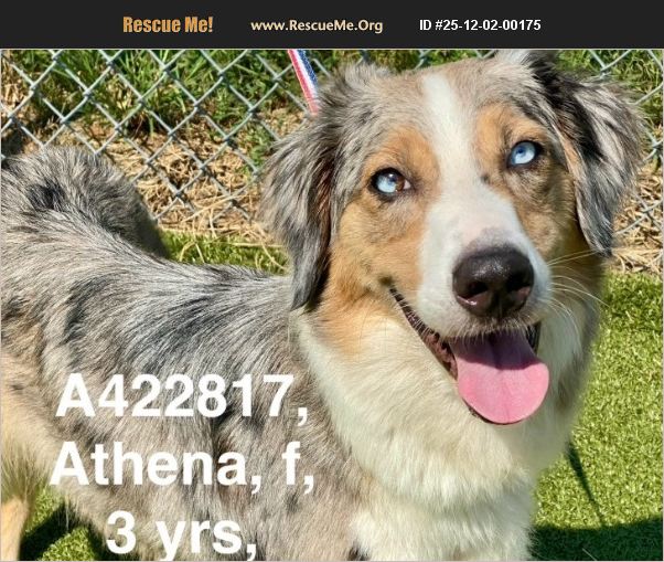 **FULL SHELTER** If you don't see me on the adoption floor, please ask staff about me. Transport help may be available. * 3 year old Australian Shepherd * weighs 31 pounds * came in as stray with a microchip but not reclaimed * heartworm positive - can be easily treated, ask staff if openings in hw program * spayed * greets you with tail wags and doggy smiles * good on leash - walks close beside you * friendly, sweet, social, happy, playful, loving * submissive and wants to please her person * gentle and well mannered * likes treats and takes them easily * affectionate but not needy * she was calm and well behaved in and out of her kennel * she is smart and easy to pick up on new things Athena is a sweet and petite little girl! She has bright blue eyes that sparkle! She loves everyone she meets and is always ready to spend time with you. She is ready for a home and family to share life, adventures, and love with. She would benefit from daily walks, runs and enrichment. She would love to go to a new home quickly! Our shelter is full, please go meet her. Athena is at Cumberland County Animal Services, Fayetteville, NC 910-321-6852