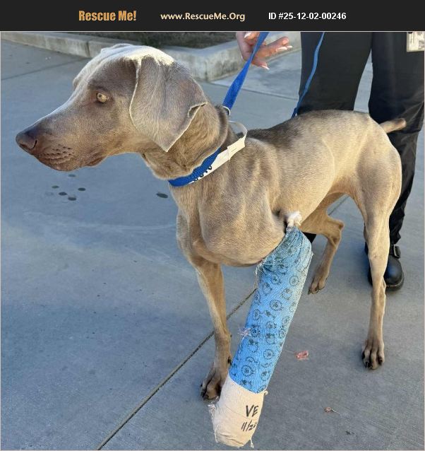 We are so happy we found HOPE today. This little pistol is around 4 years old. She was picked up by animal control with a limp possibly hit by a car. We don't know. All we know is radiographs show a fraction in her left front ulna. She is being vetted and we'll see what it takes to fix the leg. What we know so far... She is in foster in the Riverside area of the Inland Empire. She is pretty active in spite of the break and is very eager to please. She know how to sit and is potty trained. Her foster siblings are all girls, all weimaraners and she is doing well with all of them. Out of the shelter today she got a much needed bath and seemed to enjoy feeling clean. She stood well while being bathed then did what zoomies she could with a splint on. She ate a nice bowl of food and then napped in luxury without the horrible sights and sound of the shelter. It is hard not to fall in love with her winning personality. It is so hard to believe nobody claimed her. Hope will be available when we know more about her needs for the broken leg. We know she will be in demand when she heals, so if you're interested let us know now so we can put you in line! www.socalweimrescue.org/pages/adopt