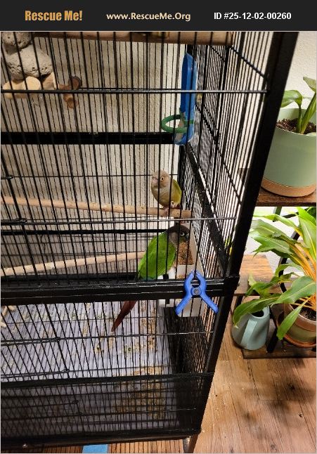 2 green cheek conures with cage and toys. owner died and i cant keep them. sweet and they love to cuttle. don't know much about them.