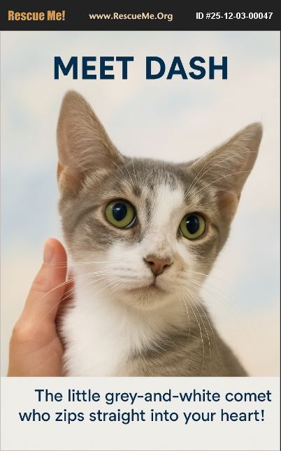 (Central Texas Adoption Only & Home Delivery) Meet Dash - the little grey-and-white comet who zips straight into your heart! This affectionate, high-energy kitten lives up to his name in every way. He dashes across the room to greet you, dashes after toys with Olympic speed, and dashes onto your lap the moment you sit down. �Ϭ Personality Highlights Super affectionate - loves pets, snuggles, and being close to his human Full of joyful kitten energy; his playtime zoomies are legendary Curious, confident, and ridiculously fun to watch Soft grey-and-white coat and expressive eyes that make him irresistible Dash is the perfect companion for anyone wanting a playful kitten who also gives plenty of love. He'll brighten your home, your day, and your heart - all in a Dash.