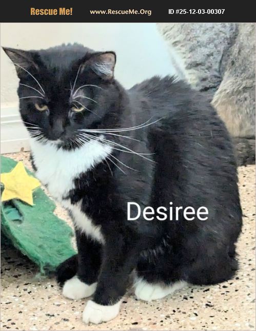 Desiree is a beautiful medium hair length Tuxedo cat. She is about 2 years old and very shy. She has been at the rescue quite awhile. Given the opportunity to be in her own home and receive love and affection from HER person she will come around. To mee this beauty call or text239-851-3485
