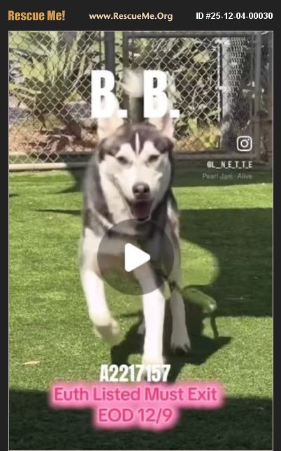 https://www.instagram.com/reel/DRxtz7JkvB0/?igsh=NTc4MTIwNjQ2YQ== ��s���s�B. B. #A2217157 has been added to the euthanasia list for space. The Shelter claims it's at capacity. He must exit by end of day 12/9 or be euthanized on 12/10. ��%BC He is a young, sweet, affectionate, playful boy who has been waiting at the shelter since August. He has been lost in the sea of dogs at South LA animal shelter. He is two years old neutered and weighs only 51 pounds. He's a great dog. Please go meet him at ���%8D