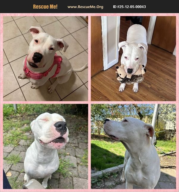 Luna is a beautiful 6-year-old Dogo Argentino who needs a new home after a change in her family's living situation. She's a loving and loyal companion who bonds quickly and wants to be near her people. She weighs about 80 pounds and is gentle with kids, good with cats, and can do well with dogs with slow introductions and time to settle in. New adults also need to be introduced since she's protective at first, but once she knows someone, she's warm and silly. Luna is fully house trained and not destructive, though she does bark when she gets excited. She has some separation anxiety, so she'll do best with someone who's home often and can provide a steady routine. She loves long walks and can sometimes pass other dogs on walks without issue, though other days she needs space. Her owner has been working on this with treats and gradual exposure. She enjoys running and playing, but tires quickly and always returns to sniffing everything around her. Luna has no known medical issues. She's spayed and up to date on all shots. She does have a mild chicken allergy, so chicken-free food and treats are best. Luna is sweet, funny, and full of quirks. She waits for a little encouragement before hopping on the bed and barrels down stairs without worrying who's in the way. If you say 'get him Luna,' she'll chase her favorite person with pure joy. She loves squeaky toys, loses interest in most others, and thinks strawberries, bananas, peanut butter, and cheese are the best treats in the world. Luna is located in Garfield, NJ, and is ready for someone who can give her attention, patience, and a secure, loving home. This dog is being featured to help the owner find a loving home for them. I may answer questions or communicate with potential adopters, but all adoption decisions and arrangements are handled by the owner. I don't charge fees and am not responsible for the outcome. Senior Dogs Rock is not a registered business or rescue; I am assisting as an individual.