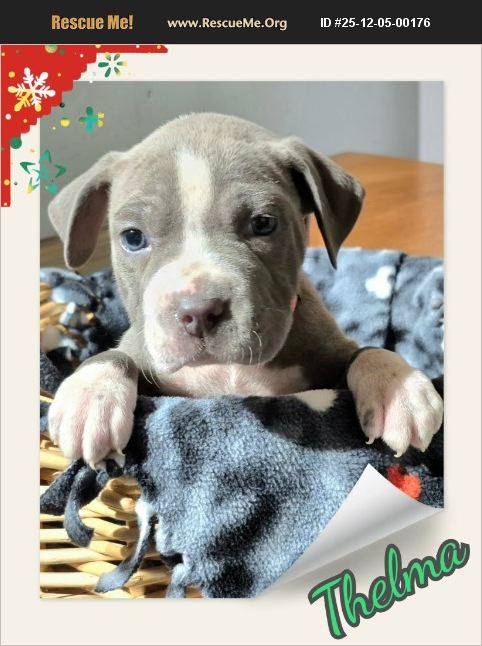 Meet Thelma, a charming and friendly puppy who will shower you with kisses! She's a Pit Bull pup who was born October 15th, 2025, and currently weighs 6.3 Lbs. Thelma's adorable behavior will capture your heart as she frolics with her beloved stuffed toy or playfully chases her foster sibling's tail. After playtime, she loves to snuggle and nap in your lap, often starting the cuddling with a soft kiss. Thelma's ready to offer a lifetime of joy and steadfast loyalty to her eventual forever home. Thelma will be provided with all 3 sets of puppy vaccinations, dewormed, and micro-chipped. $95 rescue adoption fee applies along with a spay contract. If you would like an adoption application and to set up a meet and greet, E-Mail or call or text Lori at: 760-680-3713 Located in Grove, OK. More pictures and video available upon request.