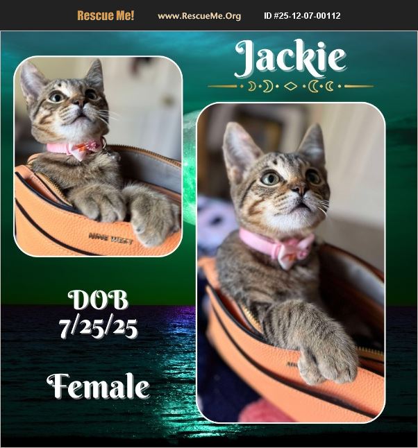 Meet Jackie: Your Playful Purr-Machine! Looking for a kitten with personality? Say hello to Jackie, a gorgeous brown tabby born on July 25, 2025! Jackie is a little dynamo, full of life and love! She's incredibly social and will happily join in on any activity. Her favorite pastime is, without a doubt, playing-she has an endless supply of energy and fun in her little paws. When the playtime is done, she transforms into a sweet, little shadow, proving just how very affectionate she is. She loves to cuddle up and give you all the purrs she can muster. A Little Note About Jackie's Charms: Be prepared for the occasional 'cry baby' serenade! When Jackie is in need of your attention, she's not afraid to let you know with a sweet, insistent little meow. It's her adorable way of reminding you she needs a snuggle, a treat, or a good scratch behind the ears! Could this playful, attention-loving tabby be the newest member of your family?
