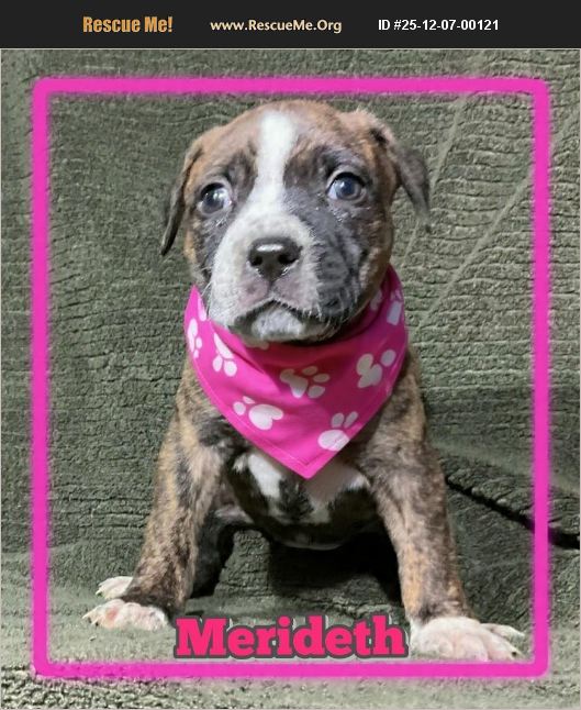 Let me introduce you to Merideth! Merideth is a Pit Bull born on October 15th, 2025, and she currently weighs 6.7 Lbs. This healthy and vivacious pup who loves to play is all ready for her new family. Merideth has her bags packed and is waiting for you to pick her. For many people, Pit bulls are ideal companions: playful, willing to please, and moderately active. They are fun, generally obedient dogs that love to play games, especially those that are challenging and physical. Pit bulls are also generally quiet in the house and are not prolific barkers. They are fair watchdogs and protectors. Pit bulls are fast learners, capable of advanced obedience. Merideth will be provided with all 3-sets of puppy Vaccinations, dewormed, and micro-chipped. A $95 rescue adoption fee applies. If you would like an adoption application and to set up a meet and greet, E-Mail or call or text Lori at: 760-680-3713 Located in Grove, OK.