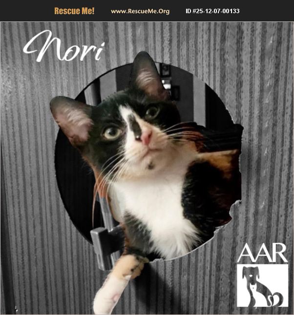 Nori is a lovely female kitten who enjoys time with her favorite humans as a shoulder cat. She thinks people are the perfect perch. She is playful and energetic and would do best in an active home or with a playmate. Nori has not been around cat friendly dogs or young children.