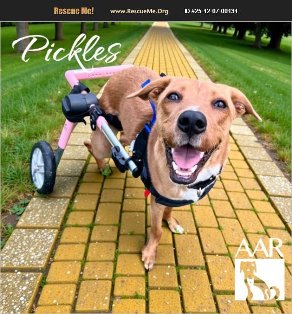 Pickles is a bright, resilient little sweetheart with a genetic deformity that affects her femur and kneecaps. Despite her challenges, she has shown nothing but courage and trust. She was a wonderfully cooperative patient during her surgeries, and the vet staff absolutely adored her. Although the procedures weren't successful, Pickles took everything in stride, never losing her gentle spirit. Now, Pickles zips around in her canine cart-which she loves! She happily trots around the yard and even enjoys playtime with her sister, Pumpkin, while cruising in her wheels. Pickles is looking for an adopter who can provide a few accommodations to support her mobility needs. In return, she will give endless gratitude, unwavering loyalty, and all the love her little heart can offer. Est. DOB: 1/1/25 31 lbs. AAR does not transport for adoption.