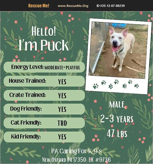 Dog is coming soon. More information and area fostered will be posted once they are available. All dogs are kept up to date on vaccines and preventatives while in foster care. New Oxford PA 17350; LIC #9736�'�� We are PA Caring for K-9's, an all-breed dog rescue that is solely run by volunteers. Most of our dogs are rescued from high kill shelters in the South. If the dog is posted, they are still available! Once arriving, these dogs enter foster homes, as we do not have a shelter. We cannot adopt out dogs to a home with dogs that are not fixed or up to date on shots. If interested in adopting, please submit an application online at www.pack9rescue.org. Our adoption fee for altered dogs is $350 and goes directly to saving the lives of more dogs. Our adoption fee for unaltered puppies will be $400 which includes a refundable $50 deposit upon receipt of spay/neuter certificate. Learn more about adopting from us or volunteering for us at www.pack9rescue.org or check us out on Facebook for more information and a complete list of dogs available for adoption. https://www.facebook.com/PaCaringForK9s/ See upcoming events below where PA Caring for K9's will be with some of our adoptable dogs! Saturday, December 20, 2025 10am-1pm Lowe's East York (2449 E. Market St York, PA, 17402) Saturday, January 24, 2026 10am -1pm Ciocca Nissan of York (1212 Loucks Rd York, PA) Saturday, February 28, 2026 10am-1pm That Fish Place That Pet Place (237 Centerville Rd Lancaster, PA) Please check our Facebook page closer to each event as we will update daily with dogs who will be attending. All are invited to meet our dogs, but only pre-approved adopters with all household humans and dogs present will be able to adopt at the event. Apply today at https://www.pack9rescue.org/applications/ to become pre-approved. �'��