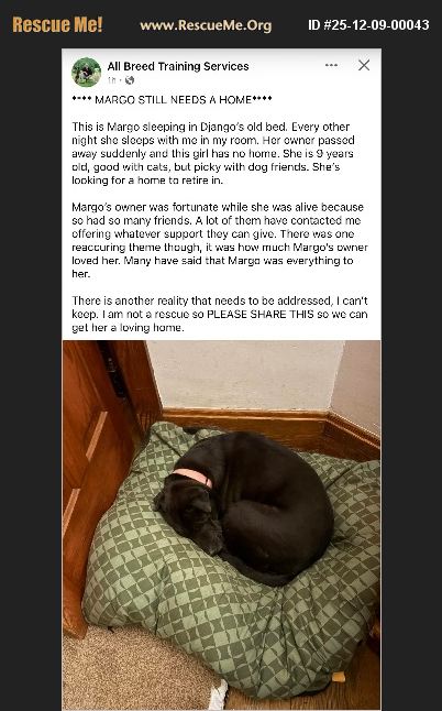 Margo's owner died suddenly in a tragic accident on Nov 17, 2025. The trainer, All Breed Training Services, who trained Margo 7 years ago has the dog and is trying to find a permanent home for her. She is currently located in Bolivar, Ohio.