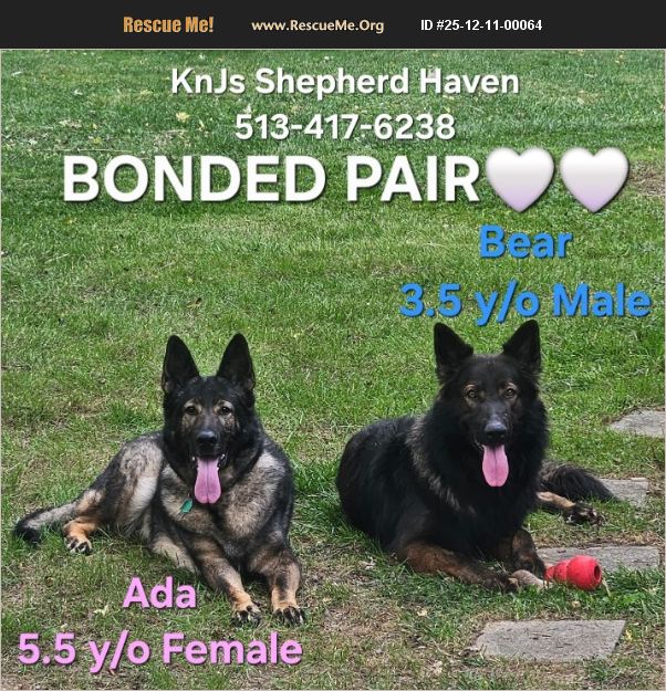 CONTACT ME: 513-417-6238 or EMAIL: [email protected] ***Trying to keep this amazing breed OUT of shelters, so please HELP me by SHARING this post and/or sending to anyone that may be interested in adopting. IT TAKES A VILLAGE, AND YOU ARE MINE Those of you that rescue/adopt these Shepherds in need instead of paying a Breeder, YOU are the REAL TRUE HEROES.***Thank you so much. AKC REGISTERED BONDED PAIR!!! WILL SEPARATE ONLY IF NECESSARY TO SAVE THEM! [Case opened on 12/11/25]. URGENT!!! AT RISK FOR SURRENDER/EUTHANIZATION! DEADLINE 2/1/25! CINCINNATI, OHIO . (willing to drive up to 50 MILES ). HER: 5.5 Y/O FEMALE GSD, AKC REGISTERED (DOB: 1/?/19). HIM: 3.5 Y/O MALE GSD, AKC REGISTERED (DOB:5/?/22 ). (The Current Shepherd Parent is trying to find the AKC Registration papers, if not able to find, will provide the necessary information needed for the New Shepherd Parent to register if requested). Her name is: 'ADA' His name is ' BEAR'. Background: the Current Shepherd Parent and her now ex-husband has had both of these Shepherds since weaned . BOTH: UTD on shots WITH record. Ada is now due for Lepto. ADA IS SPAYED. BEAR IS NOT FIXED. BOTH: Good with kids. ADA: Good with dogs. BEAR: UNKNOWN. BOTH: Good with cats. BOTH: House trained. BOTH: Crate trained. Any known medical issues?: ADA: Beef Allergy and Separation Anxiety. If she gets extremely anxious, she will chase her tail and pull her hair out. BEAR: Flea Allergy . ENERGY LEVEL: ADA: MEDIUM BEAR: HIGH. PREY DRIVE LEVEL:BOTH: AVERAGE . Weighs BOTH: 89 lbs. BOTH: Currently on 'Natural Balance Original Ultra Grain Free Chicken Formula Dry plus Cosequin Joint Supplements food. Good with car rides?: BOTH: YES. Socialized with: *people?: BOTH: YES *dogs?: ADA: YES. BEAR: NO. Good with meeting new people? (ALWAYS USE PROPER INTRODUCTION!): BOTH: YES. Loves: ADA: food - peanut butter - balls - going on walks - cuddling - chilling on the couch - playing with kids - her brother Bear - fetch - being near her person - Benebones- pup cups playing in water/lakes- finding rocks in creeks and will put her head all the way underwater to find the biggest rock LOL. BEAR: balls - going on walks - toys - Kongs - cuddling - playing with kids - his sister Ada - fetch - being near his person - Benebones- pup cups- chasing balls. BOTH: *Intelligent and knows Basic Commands?:: YES . *Good Recall? (ALWAYS RETRAIN BEFORE ALLOWING OFF LEASH: YES. *Good on a Leash?: FAIR. *Lovable?:YES . *Eager and fast learner?: YES. Bite History?: NO. NOTES FROM CURRENT SHEPHERD PARENT: Such good dogs. Love and play hard. Need plenty of attention and space to run. Superb Family Dogs and great with kids. Re Homing because�'�|: The Current Shepherd Parent has recently gone through a divorce and cannot handle having this Bonded Pair or provide them with the life that they need and deserve to truly thrive. Will thrive best�'�|?: if they are kept TOGETHER with NO other male dogs, because not sure if Bear will be okay with a male dog or not. Preferably WITH kids. Preferably someone who is home often to help ease Ada's Separation Anxiety. Comes with: collars, leash. Rehoming Fee $200 Together, 150 Separate. ***If not on Facebook, please text me for more pics and full Profile*** ***Serious Inquiries, please message me for the Rehoming Form. Thank you***. Text/Call: 513-417-6238. Please JOIN OUR GROUP: Go to the ALBUM 'Current Shepherds Needing Rehomed' and it will show all of the Shepherds that we are trying to find great homes for. Please message me if you are interested in any of them. Thank you https://www.facebook.com/groups/593859788742255/?ref=share